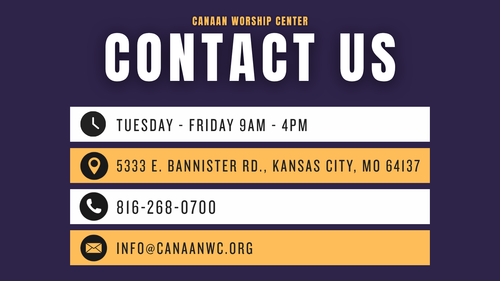 To contact Canaan Worship Center by email, fill out the form below with your question or comment. Your email will be forwarded to the appropriate department for a response. Thank you for contacting us!
